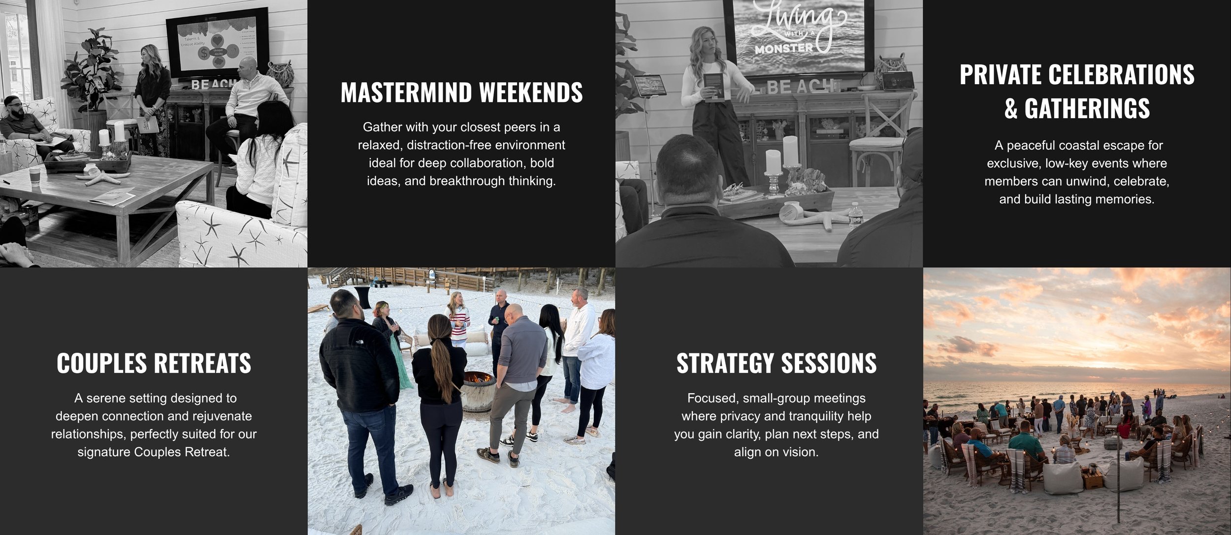 Tucked away in the heart of WaterColor, Florida, The Beach House offers a peaceful, coastal setting designed exclusively for member-only events. This intimate venue is perfect for retreats, mastermind weekends, and relaxed strategy sessions, including our signature Couples Retreat. Explore the experience in the video below to see why The Beach House is the ideal place to connect, recharge, and grow available only to our members.